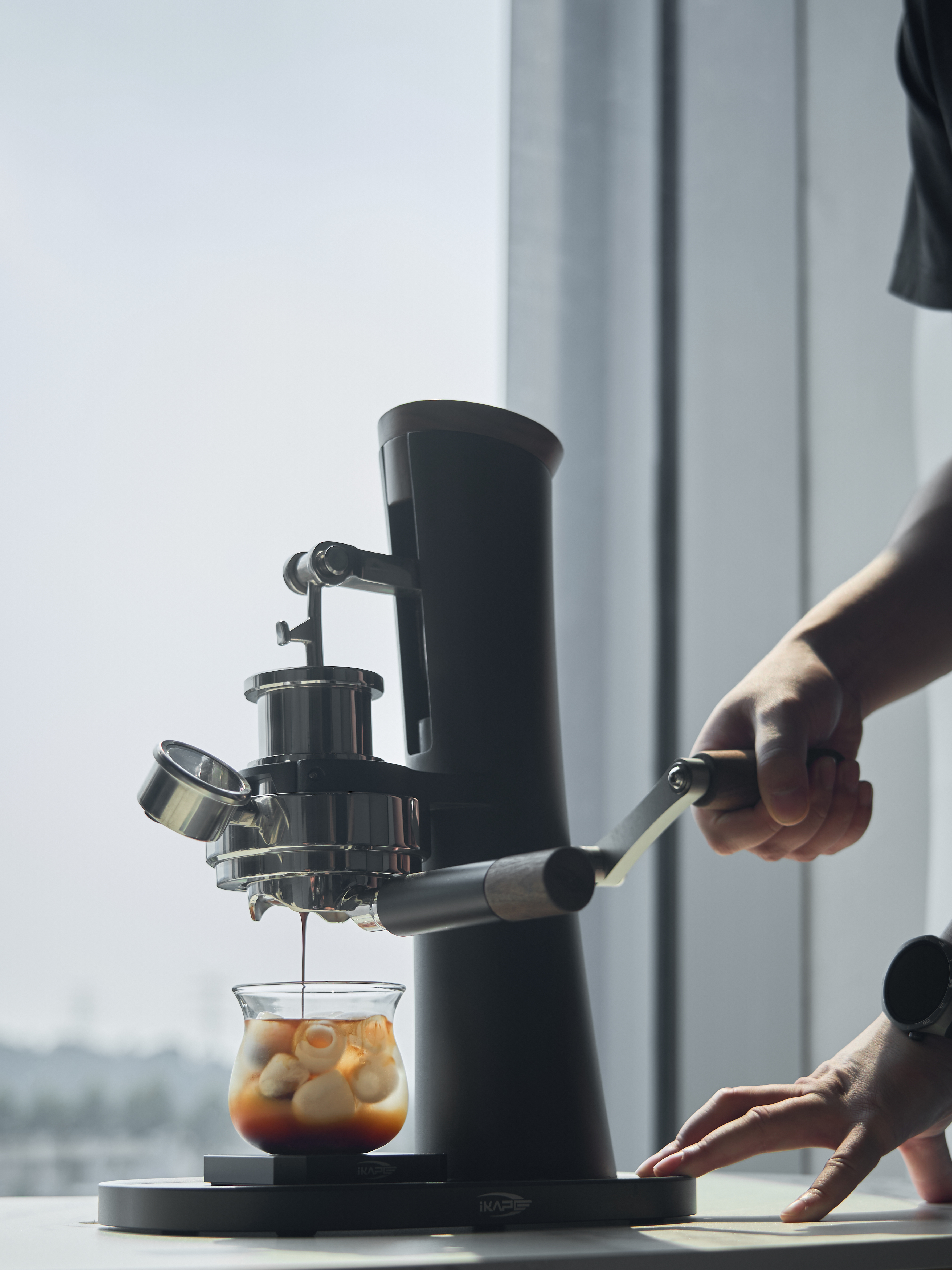 Alkaid i9은 일반적인 수동 커피머신과는 다르게 회전식 크랭크 레버 기반의 기계식 압력 추출 구조를 채택하고 있습니다. 기존 수직 레버 타입의 수동 커피머신보다 더 안정적이며, 섬세한 압력제어가 가능합니다.